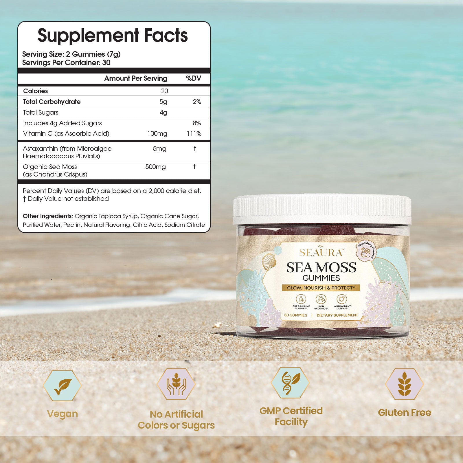 Seaura™ Sea Moss Gummies are a powerful blend of Irish Sea Moss, Astaxanthin and Vitamin C. Together, these ingredients support healthy, radiant skin while promoting gut balance, immune health, antioxidant defense and overall wellness.* Rooted in holistic living and inspired by the ocean, our delicious mixed berry flavored gummies are designed to nourish your body and skin from within. Take 2 daily, preferably with food.