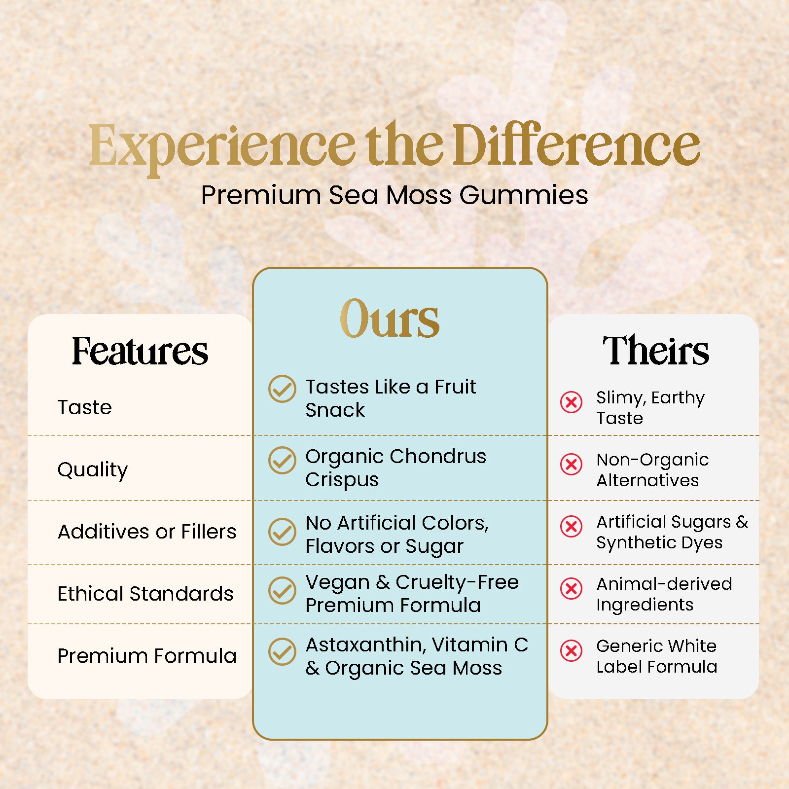Seaura™ was designed to be different. We've combined Organic Irish Sea Moss with powerful antioxidants like Astaxanthin and Vitamin C in a way that’s convenient, delicious and easy to stay consistent with. See how we compare to other brands: